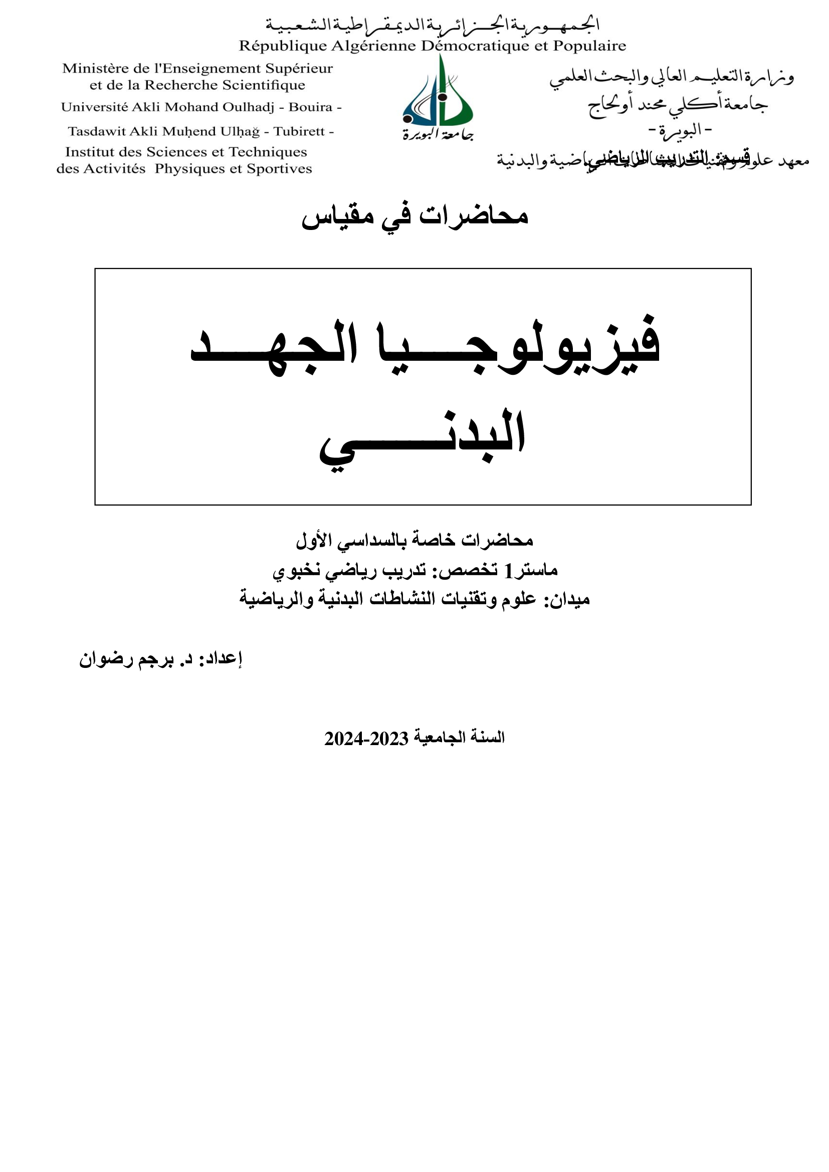 فيزيلوجيا الجهد البدني مقياس سنوي خاص بطلبة السنة أولى ماستر تخصص تدريب رياضي يشمل البرنامج الخاص بالسداسي الأول على 14 محاضرة موزعة على 14 أسبوع على شكل أربع محاور هي: