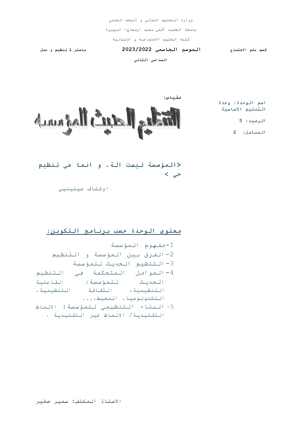 يهدف من خلال تدريس هذا المقياس الى التعريف بمجمل الاساليب التنظيمبة من خلال عرض مفصل للنظريات التنظيمية الحديث للعمل في المؤسسات على اختلاف نوعها و حجمها و شكلها و وظائفها و ادوارها ، و كذا التطرق للنظريت السوسيولوجية المنتجة في هذا الشان لتحليل المؤسسة و عامة و ارتباطاتها الداخلية و الخارجية .