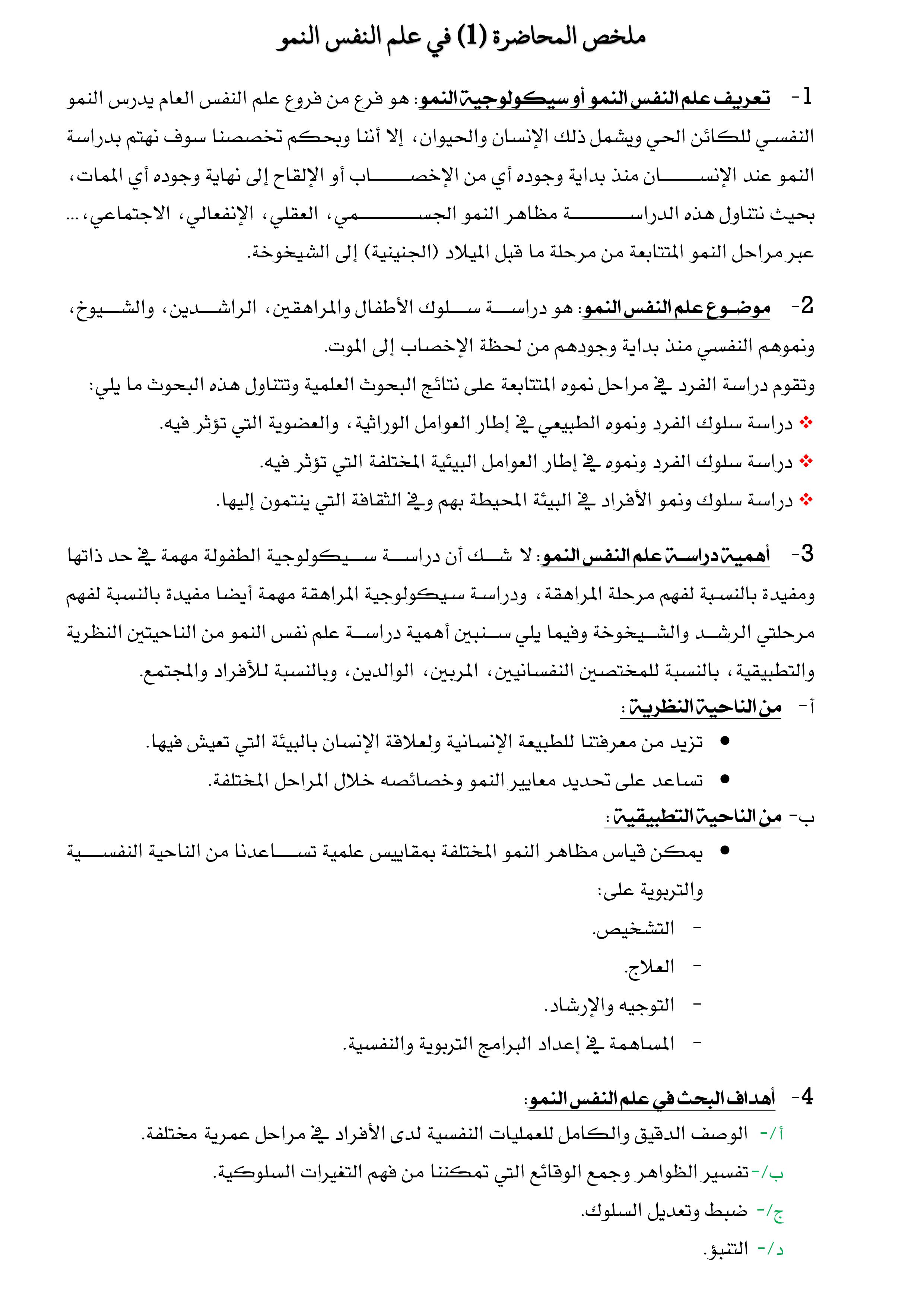محاضرة الأولى في علم النفس النمو: نعريف، موضوعه، أهمية الدراسة، أهداف البحث.