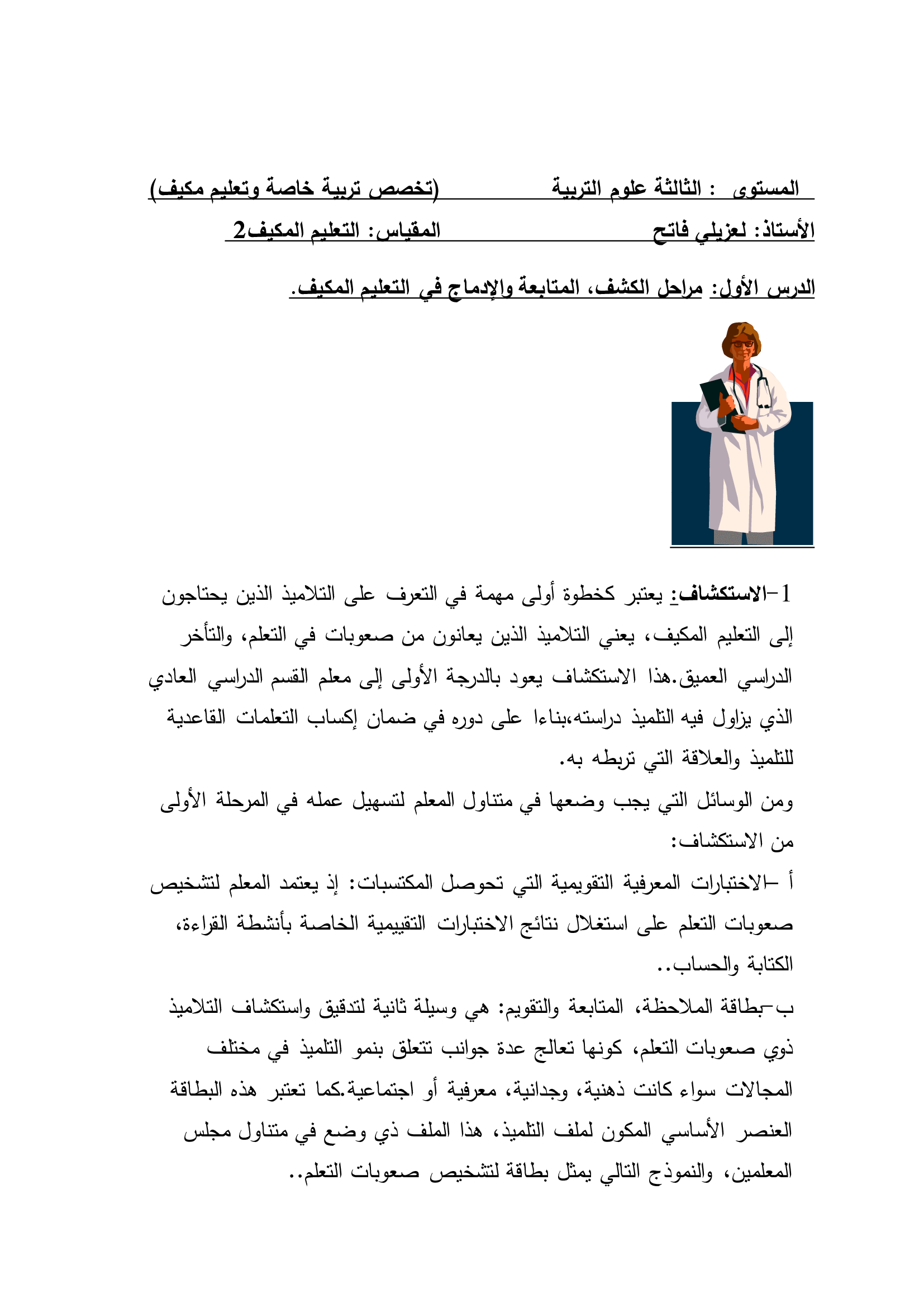 -بعد التعرف على نوع الصعوبات التي يعاني منها التلميذ، أو نوع ومستوى التأخر، يأتي قرار إحالة التلميذ نحو قسم التعليم المكيف من عدمه(أي جهة أخرى) بموافقة ولي الأمر.