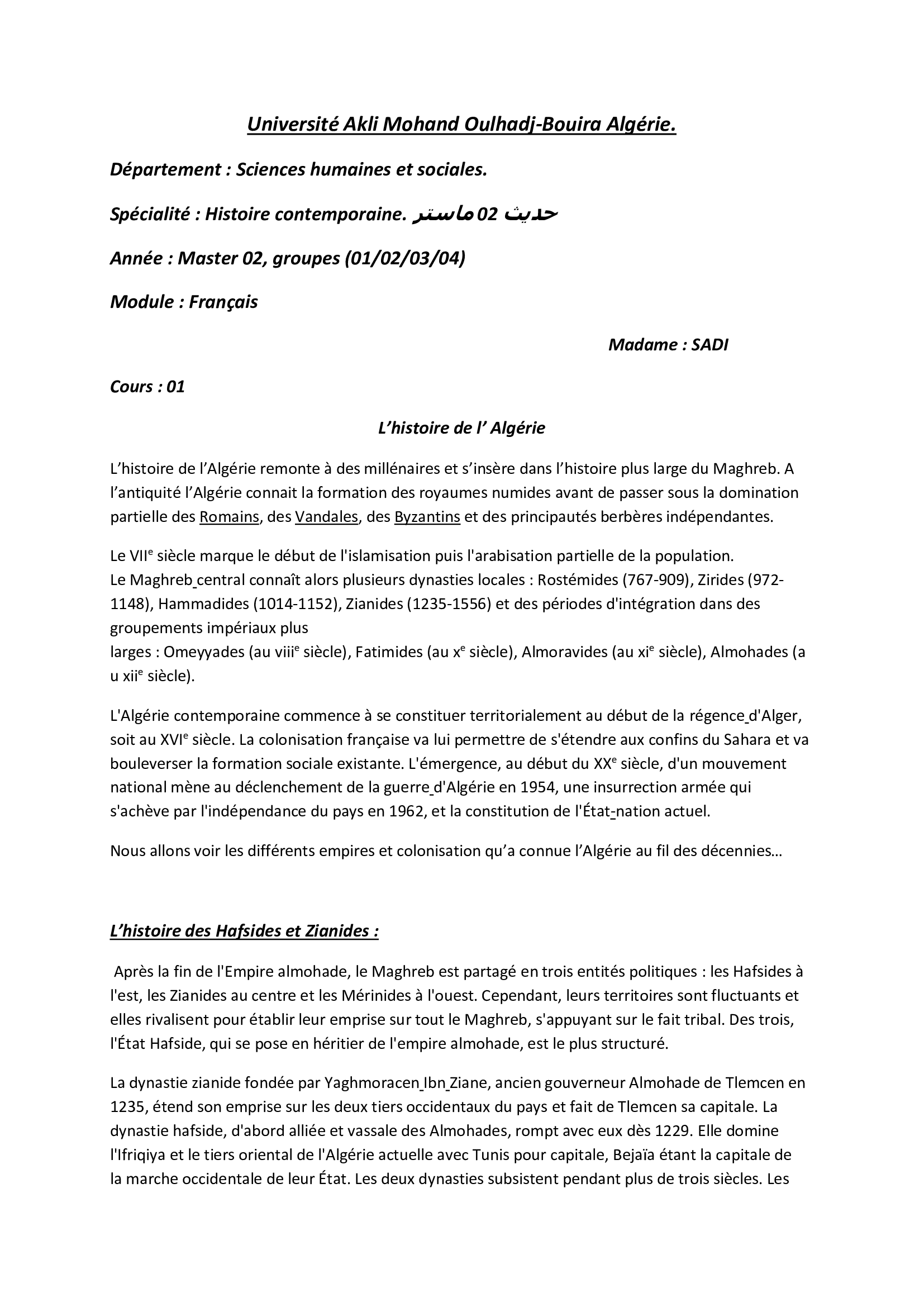 Spécialité : Histoire contemporaine. ماستر 02 حديث