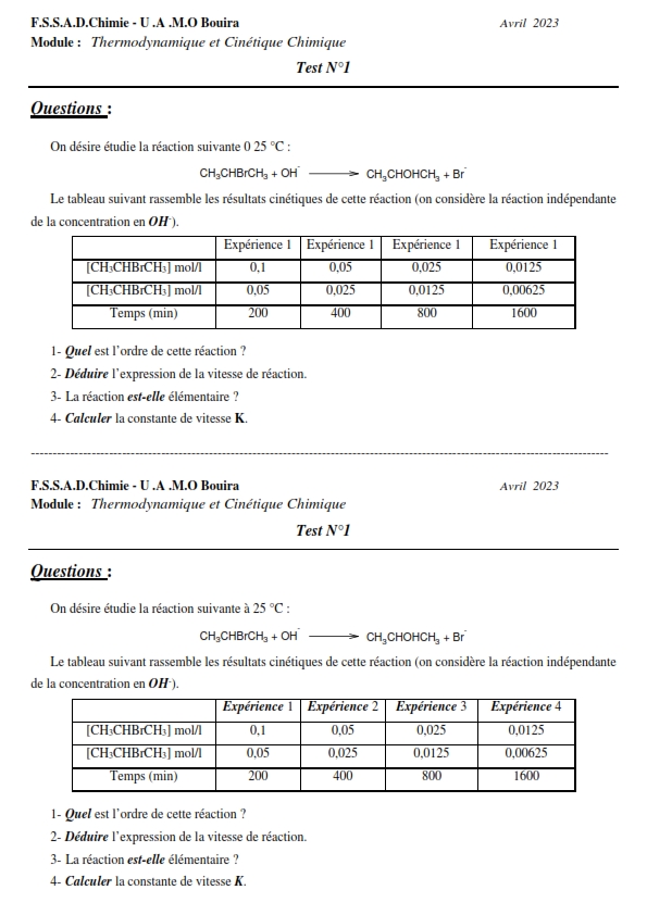 Examen de Test N° 1 Thermodynamique et Cinétique Chimique 2023