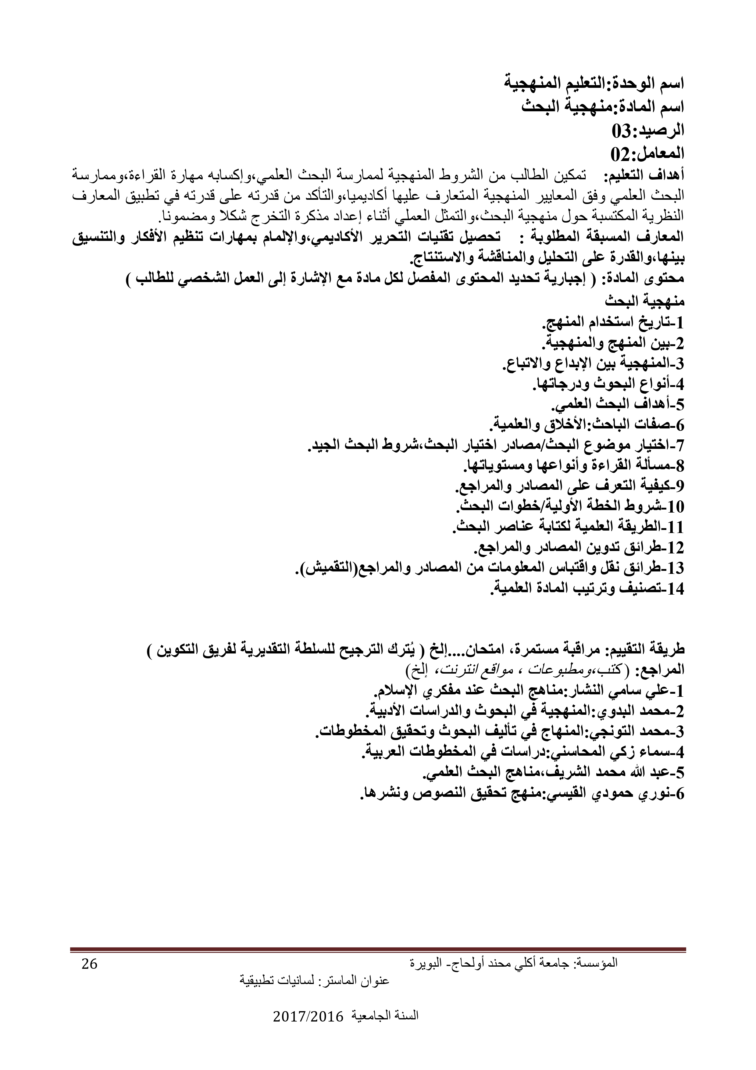 يهدف مقياس منهجية البحث الى افهام الطلبة كيفية انجاز البحوث العلمية والأكاديمية وفق منهجية ومنهج محدديين واللاذان يعتبران من أساسيات وضروريات وخطوات انجاز بحث علمي وأكاديمي.
